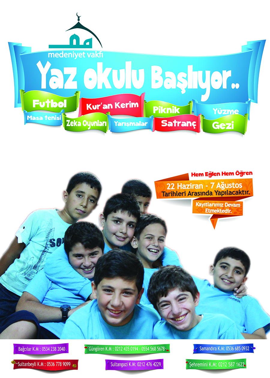 “Sizin en hayırlınız, Kur’ân-ı Kerim’i öğrenen ve öğreteninizdir.” (Buharî, Fedâilu'l-Kur'ân, 21) Medeniyet İlim Kültür ve Dayanışma Vakfı Kültür Merkezleri’nin düzenleyeceği “2015 Yaz Okulu” etkinliklerinin kayıtları Kültür Merkezlerimizden yaptırılabilecektir. Sınırlı kontenjan için lütfen acele edin.