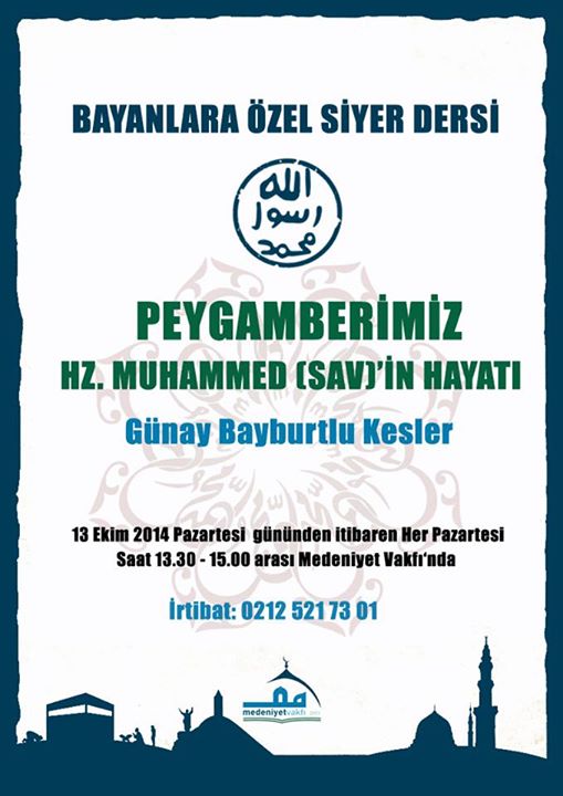 Günay Bayburtlu Kesler Hocamızla bayanlara özel “Siyer” derslerimiz 13 Ekim 2014 Pazartesi günü saat 13.30 – 15.00 saatleri arasında Vakıf Merkezimizde başlıyor. Programımız pazartesi günleri düzenli olarak devam edecektir.