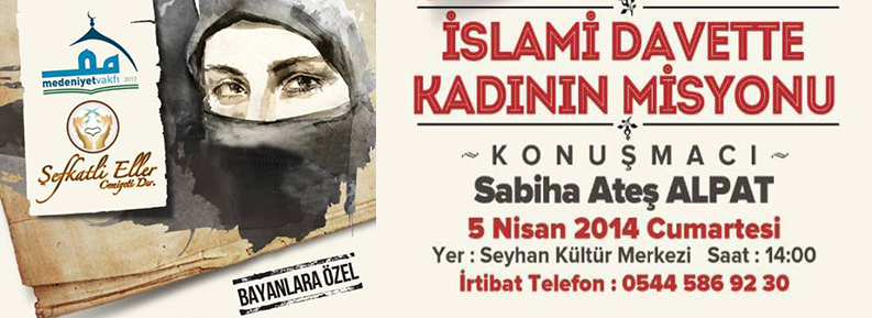 SUNUMUNU SABİHA ATEŞ ALPAT'IN YAPACAĞI ''İSLAMİ DAVETTE KADININ MİSYONU'' KONFERANSI 5 NİSAN 2014 CUMARTESİ GÜNÜ SAAT 14.00'DE, ADANA'DA SEYHAN KÜLTÜR MERKEZİNDE GERÇEKLEŞTİRLECEKTİR.